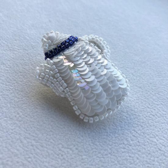 立体感の出るよう透明なスパンコールを用いているところに、ついぐっときてしまう作品。ツヤっと透明感のあるポットのひんやりとした感触まで思い起こさせてくれます。