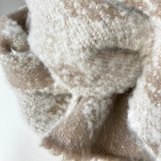 雪を想わせるフワモコな白 × 優しいベージュが、柔らかな印象のカシミヤマフラーです。